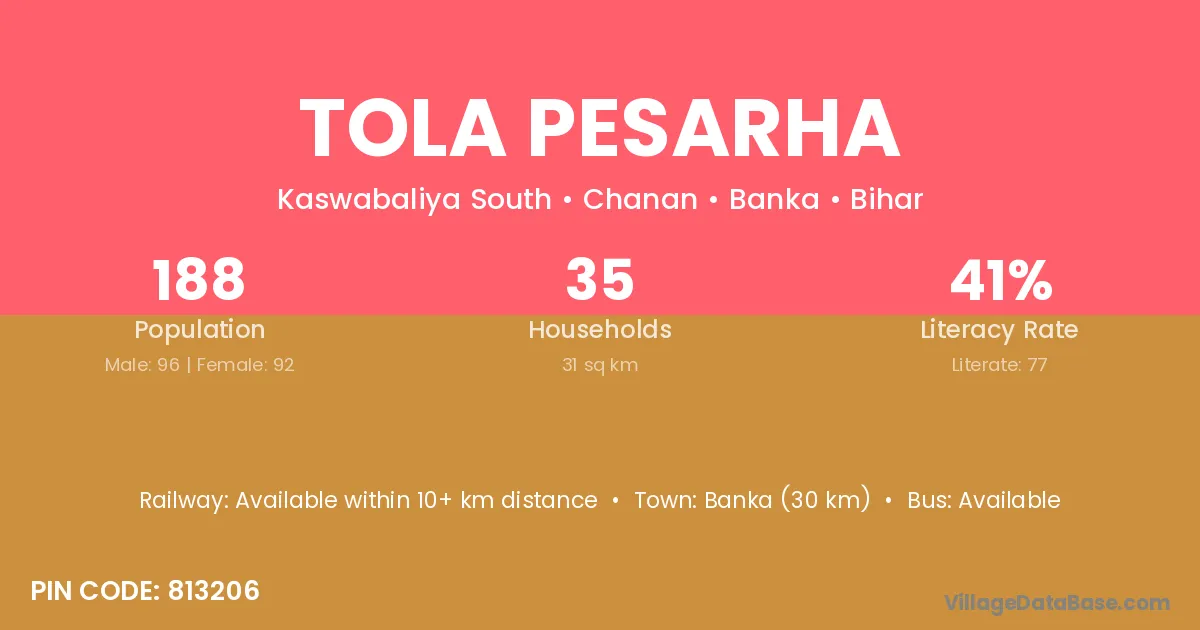 Banka (30 km) is the nearest town to Tola Pesarha village for major economic activities and is located approximately 30 km away.