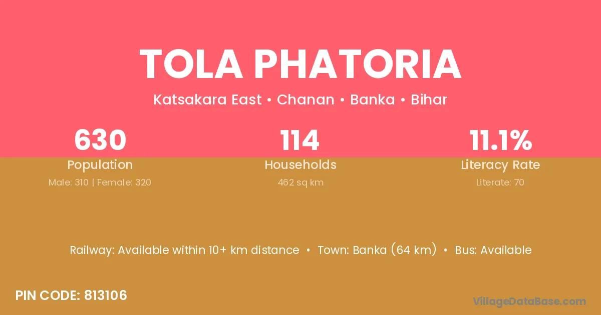 Banka (64 km) is the nearest town to Tola Phatoria village for major economic activities and is located approximately 64 km away.