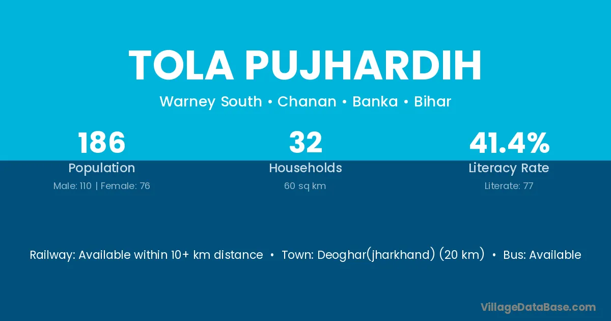 Deoghar(jharkhand) (20 km) is the nearest town to Tola Pujhardih village for major economic activities and is located approximately 20 km away.
