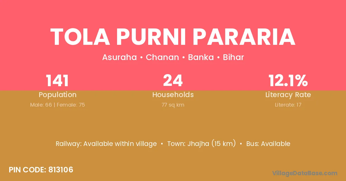 Tola Purni Pararia village has a total population of 141 people, of which 66 are males and 75 are females.