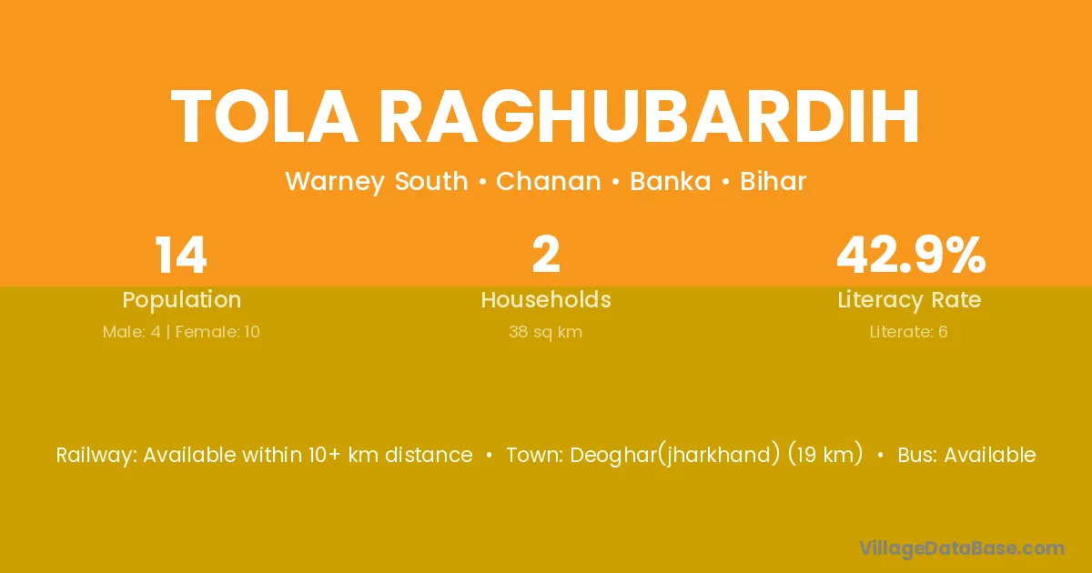 Deoghar(jharkhand) (19 km) is the nearest town to Tola Raghubardih village for major economic activities and is located approximately 19 km away.