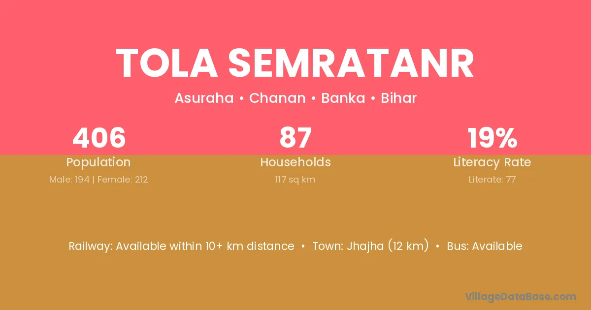 Jhajha (12 km) is the nearest town to Tola Semratanr village for major economic activities and is located approximately 12 km away.
