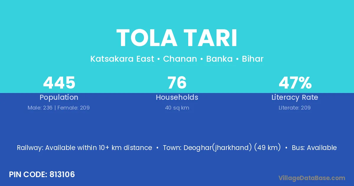 Tola Tari village has a total population of 445 people, of which 236 are males and 209 are females.