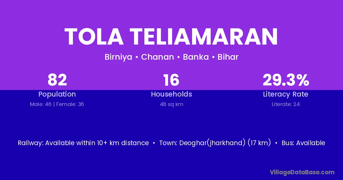 Deoghar(jharkhand) (17 km) is the nearest town to Tola Teliamaran village for major economic activities and is located approximately 17 km away.
