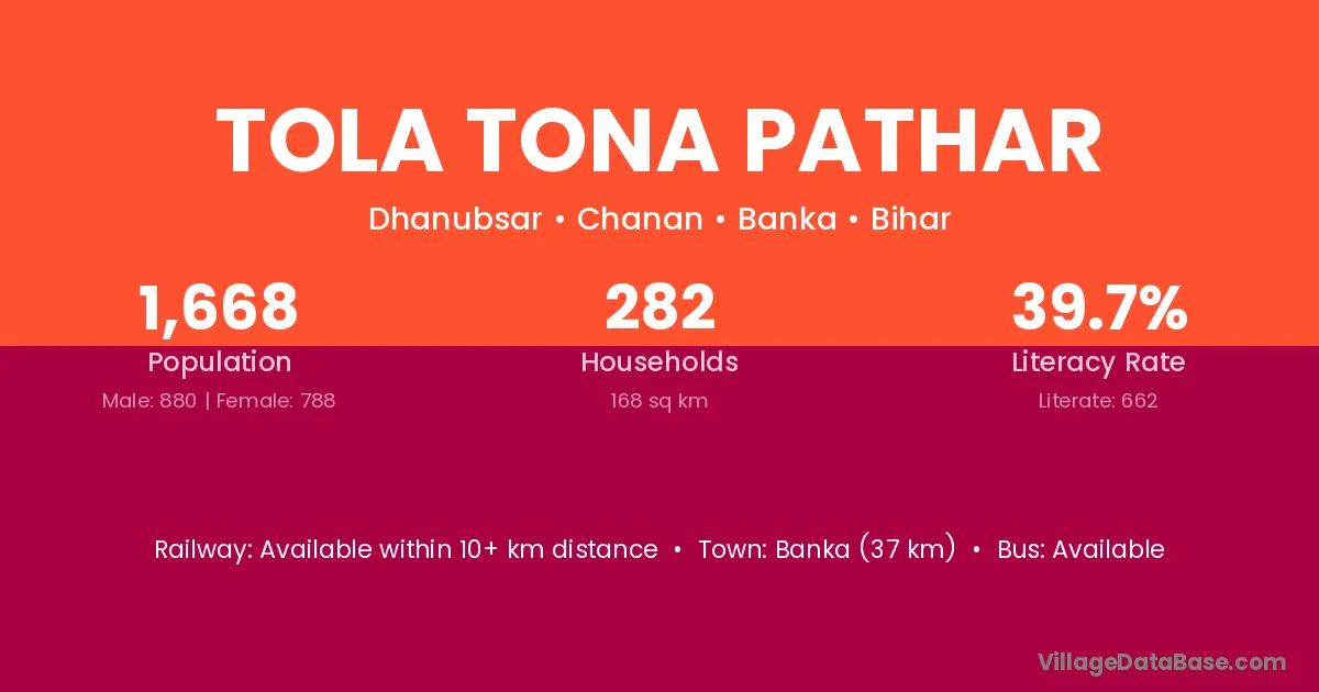 Banka (37 km) is the nearest town to Tola Tona Pathar village for major economic activities and is located approximately 37 km away.