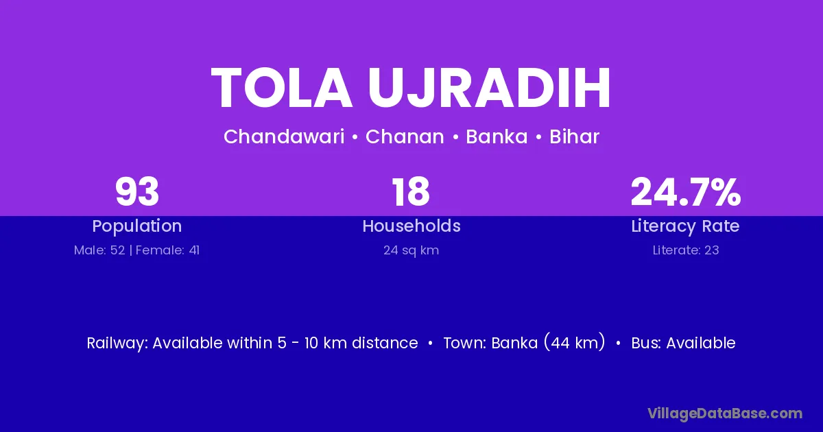 Banka (44 km) is the nearest town to Tola Ujradih village for major economic activities and is located approximately 44 km away.