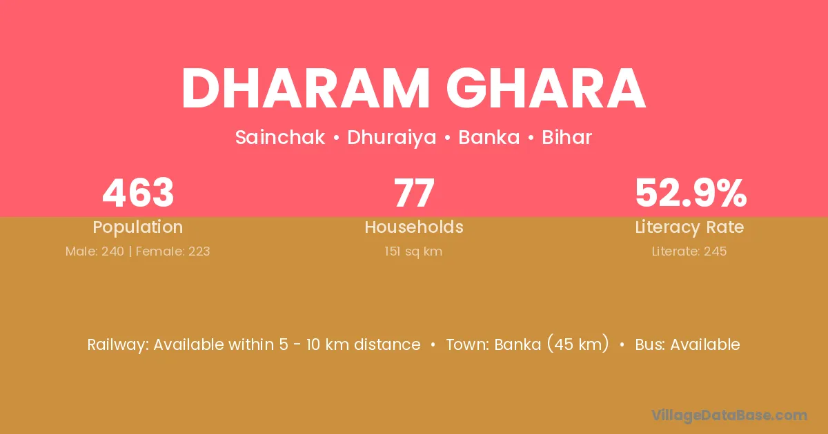 Banka (45 km) is the nearest town to Dharam Ghara village for major economic activities and is located approximately 45 km away.