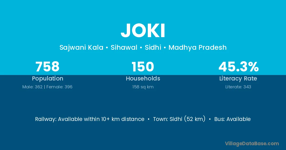 The literacy rate of Joki village is 58.51%. Male literacy stands at 68.47% and female literacy at 48.02%.