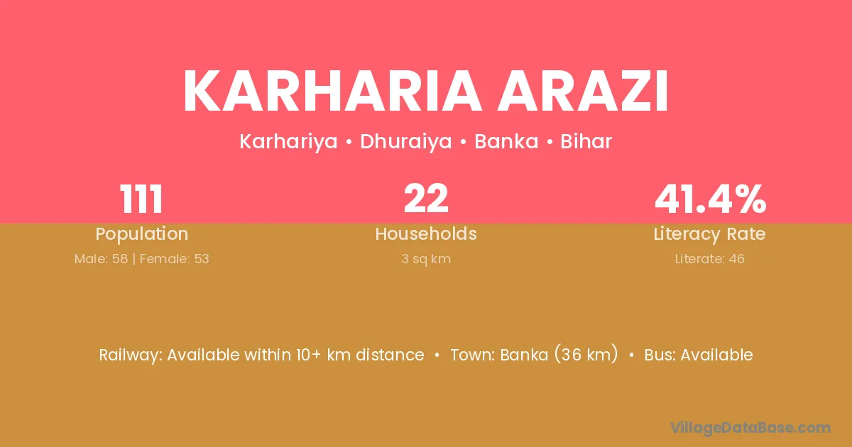 Karharia Arazi village has a total population of 111 people, of which 58 are males and 53 are females.