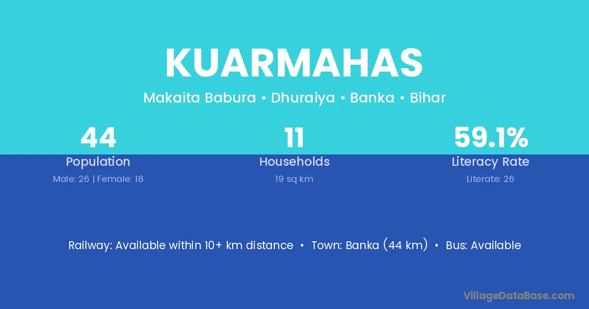 Banka (44 km) is the nearest town to Kuarmahas village for major economic activities and is located approximately 44 km away.