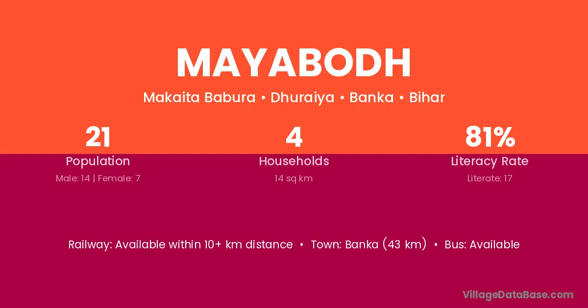 Banka (43 km) is the nearest town to Mayabodh village for major economic activities and is located approximately 43 km away.