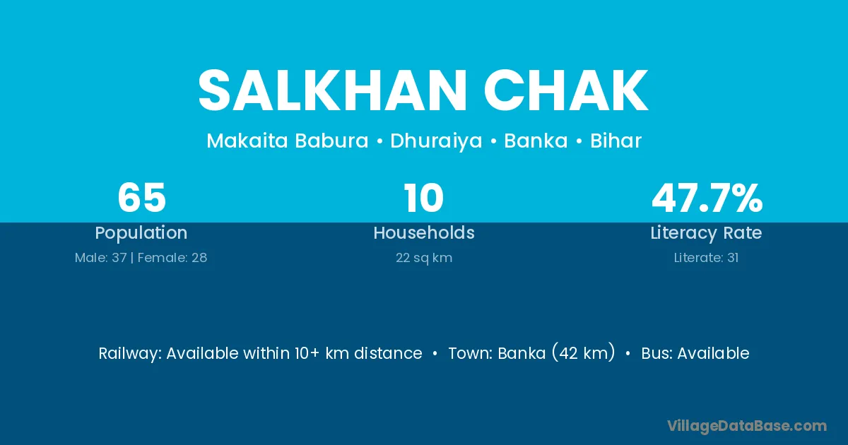 Banka (42 km) is the nearest town to Salkhan Chak village for major economic activities and is located approximately 42 km away.