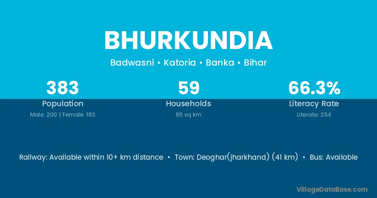 Deoghar(jharkhand) (41 km) is the nearest town to Bhurkundia village for major economic activities and is located approximately 41 km away.
