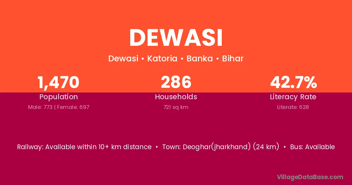 Deoghar(jharkhand) (24 km) is the nearest town to Dewasi village for major economic activities and is located approximately 24 km away.