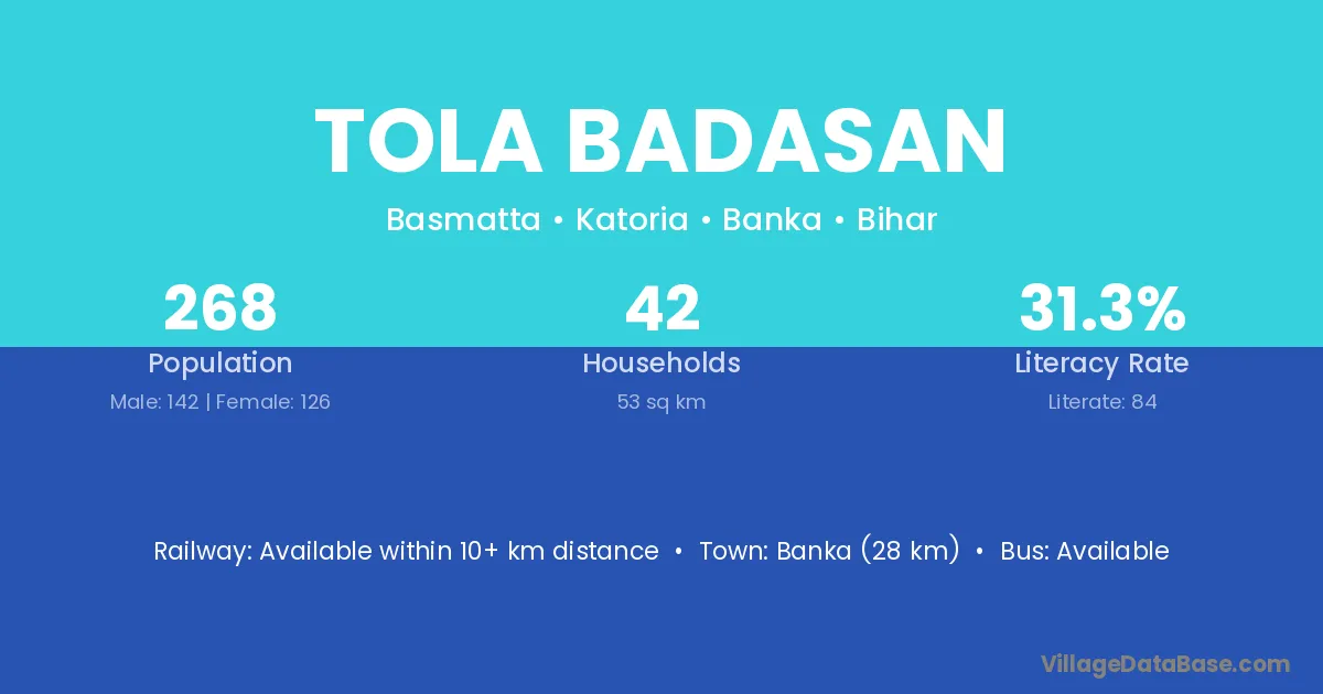 Banka (28 km) is the nearest town to Tola Badasan village for major economic activities and is located approximately 28 km away.