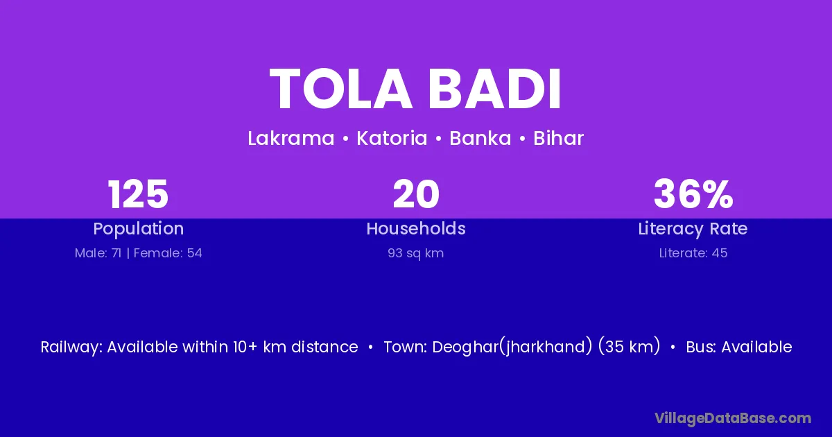 Deoghar(jharkhand) (35 km) is the nearest town to Tola Badi village for major economic activities and is located approximately 35 km away.