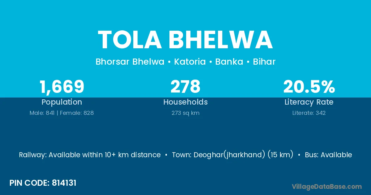 Deoghar(jharkhand) (15 km) is the nearest town to Tola Bhelwa village for major economic activities and is located approximately 15 km away.