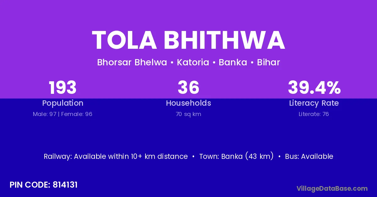 Banka (43 km) is the nearest town to Tola Bhithwa village for major economic activities and is located approximately 43 km away.