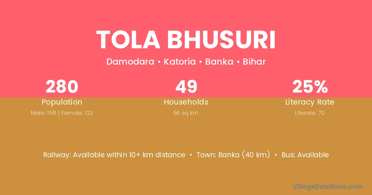 Banka (40 km) is the nearest town to Tola Bhusuri village for major economic activities and is located approximately 40 km away.