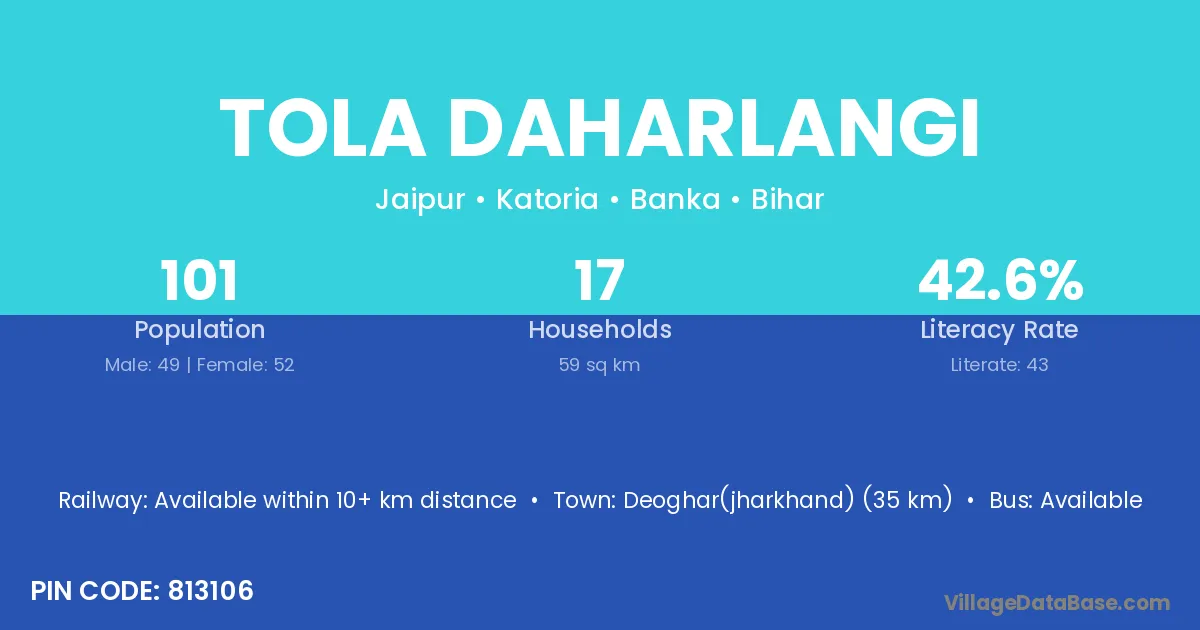 Deoghar(jharkhand) (35 km) is the nearest town to Tola Daharlangi village for major economic activities and is located approximately 35 km away.