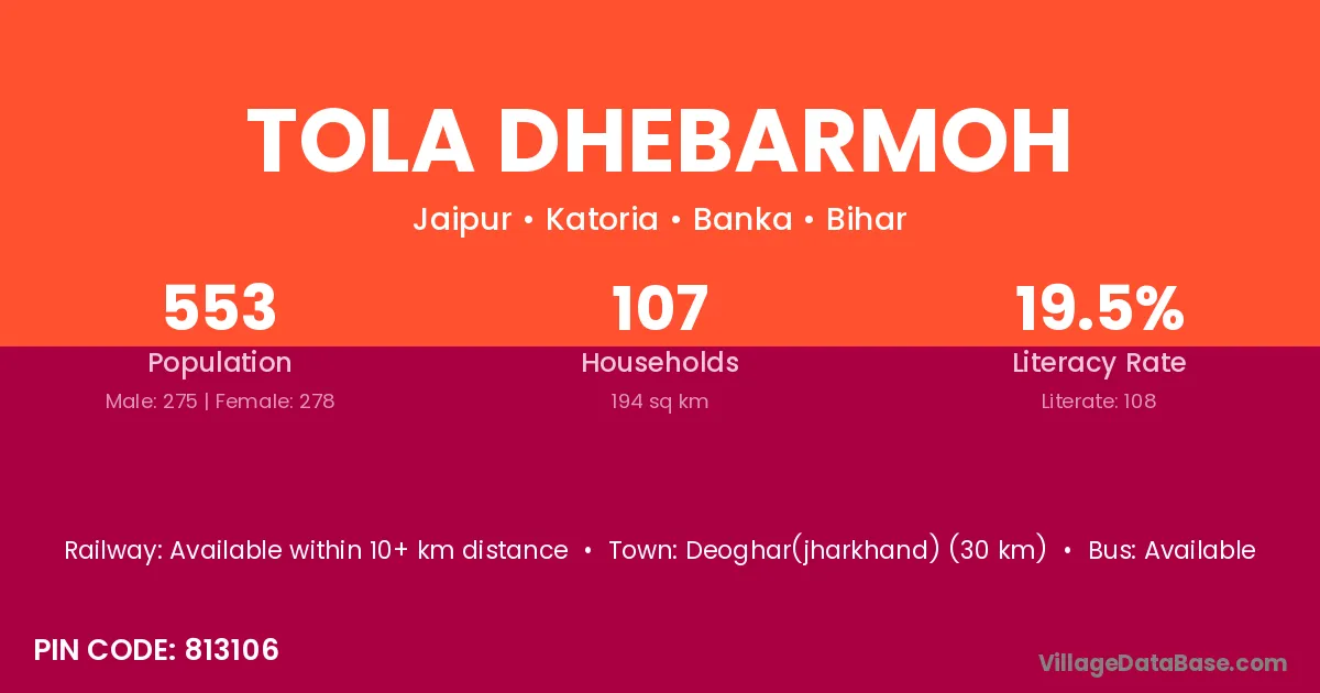 Deoghar(jharkhand) (30 km) is the nearest town to Tola Dhebarmoh village for major economic activities and is located approximately 30 km away.