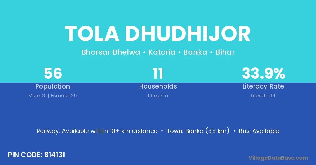 Banka (35 km) is the nearest town to Tola Dhudhijor village for major economic activities and is located approximately 35 km away.