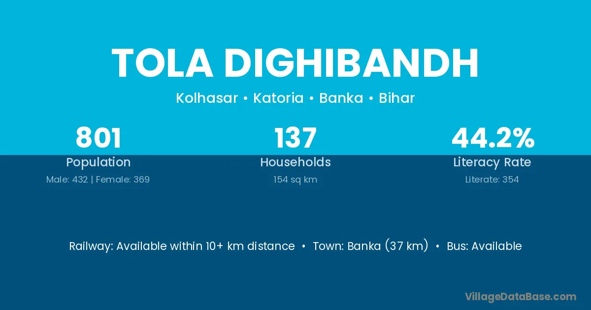 Banka (37 km) is the nearest town to Tola Dighibandh village for major economic activities and is located approximately 37 km away.