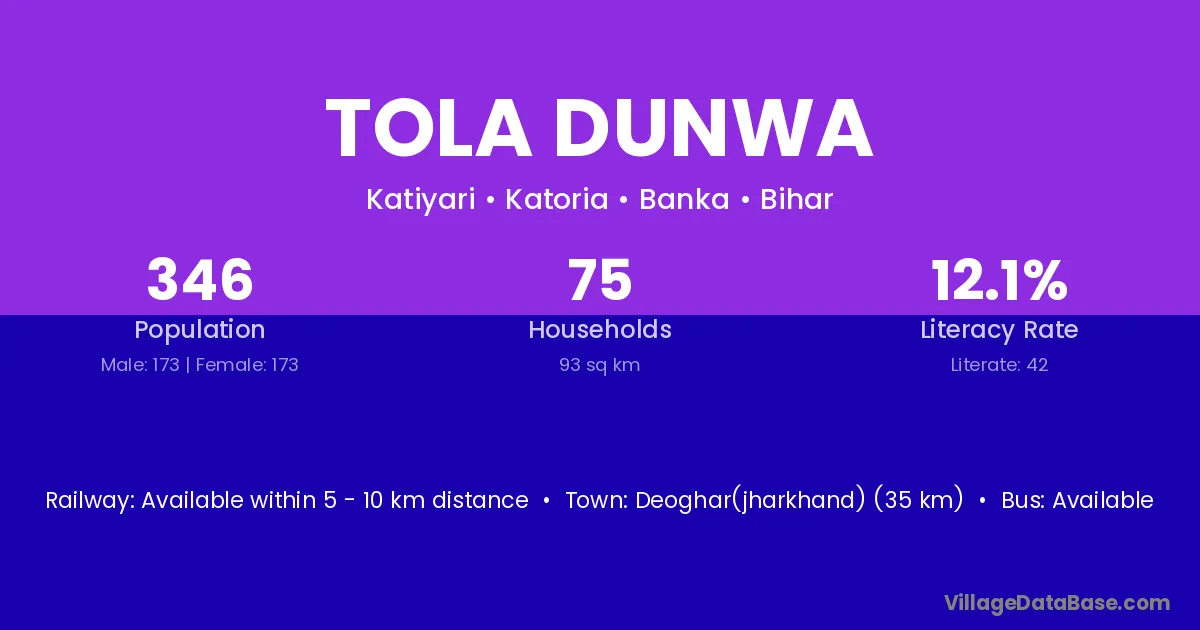 Deoghar(jharkhand) (35 km) is the nearest town to Tola Dunwa village for major economic activities and is located approximately 35 km away.