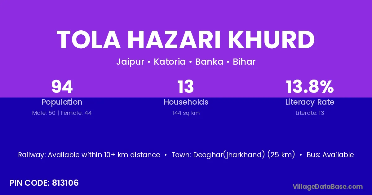 Deoghar(jharkhand) (25 km) is the nearest town to Tola Hazari Khurd village for major economic activities and is located approximately 25 km away.