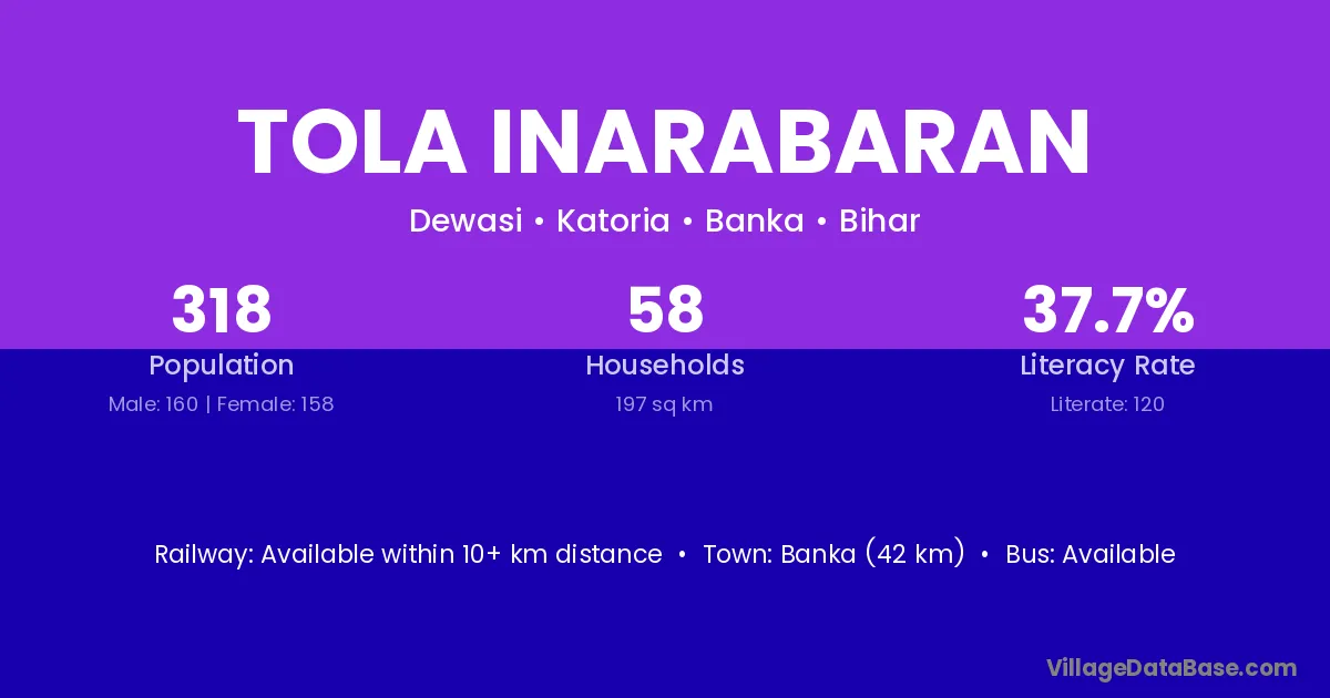 Banka (42 km) is the nearest town to Tola Inarabaran village for major economic activities and is located approximately 42 km away.