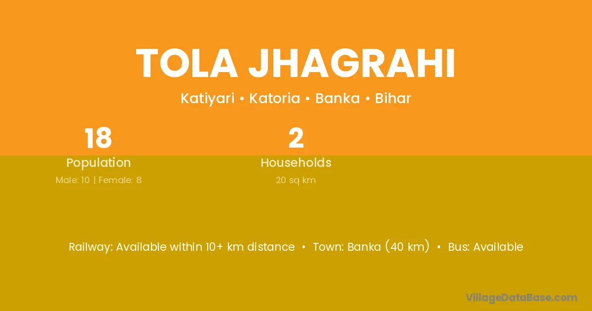 Banka (40 km) is the nearest town to Tola Jhagrahi village for major economic activities and is located approximately 40 km away.