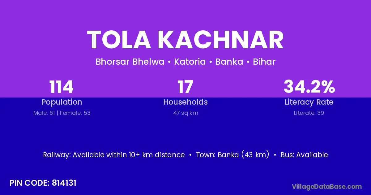 Banka (43 km) is the nearest town to Tola Kachnar village for major economic activities and is located approximately 43 km away.