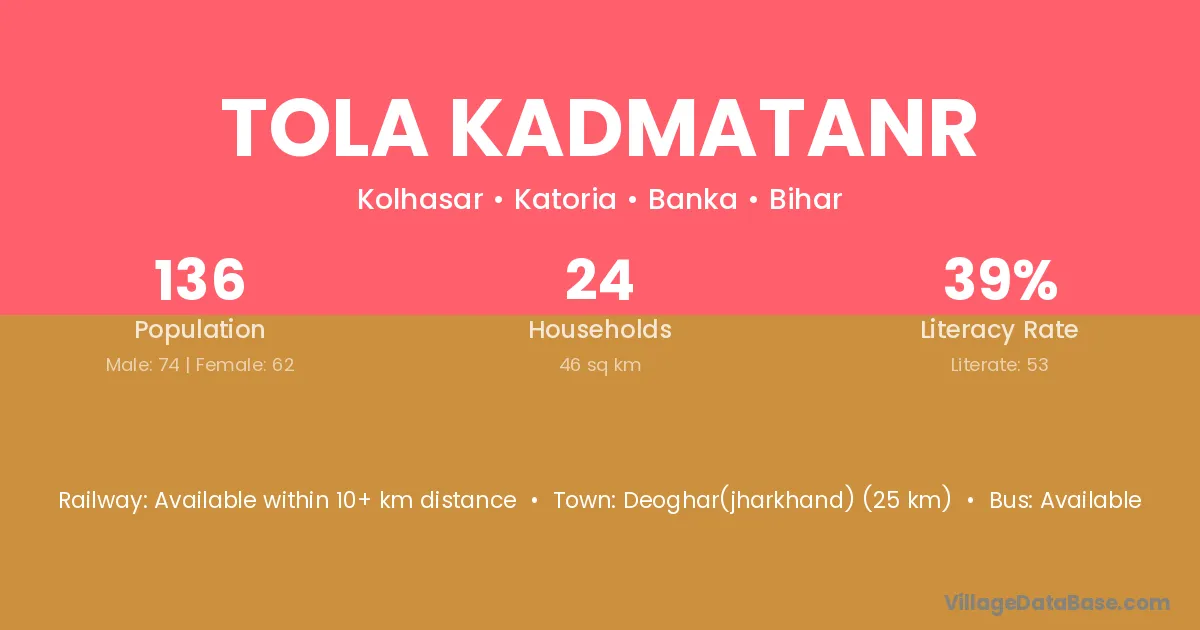 Deoghar(jharkhand) (25 km) is the nearest town to Tola Kadmatanr village for major economic activities and is located approximately 25 km away.