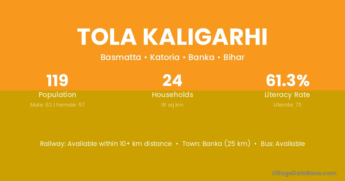 Banka (25 km) is the nearest town to Tola Kaligarhi village for major economic activities and is located approximately 25 km away.