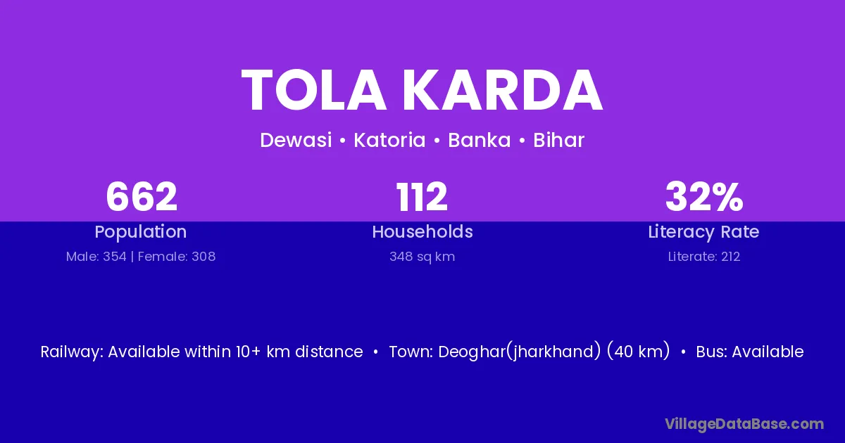 Deoghar(jharkhand) (40 km) is the nearest town to Tola Karda village for major economic activities and is located approximately 40 km away.