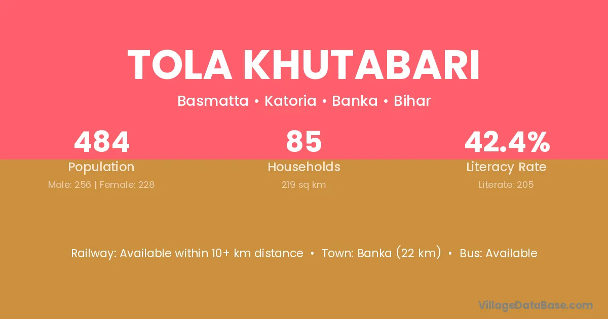 Banka (22 km) is the nearest town to Tola Khutabari village for major economic activities and is located approximately 22 km away.