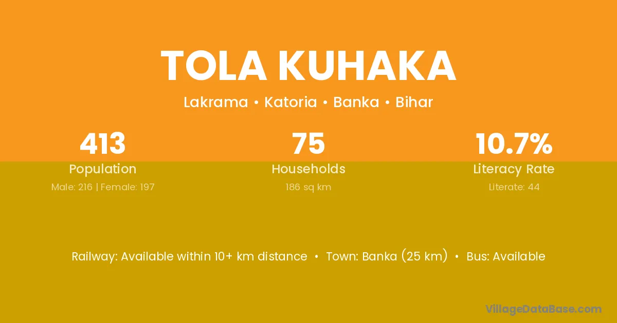 Banka (25 km) is the nearest town to Tola Kuhaka village for major economic activities and is located approximately 25 km away.