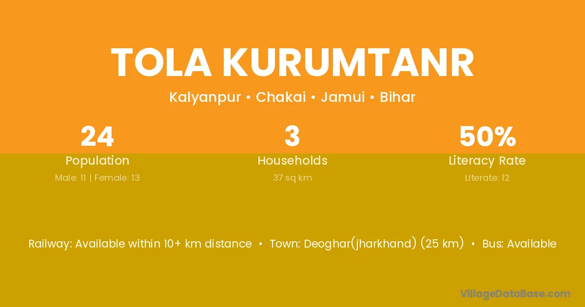 Banka (32 km) is the nearest town to Tola Kurumtanr village for major economic activities and is located approximately 32 km away.