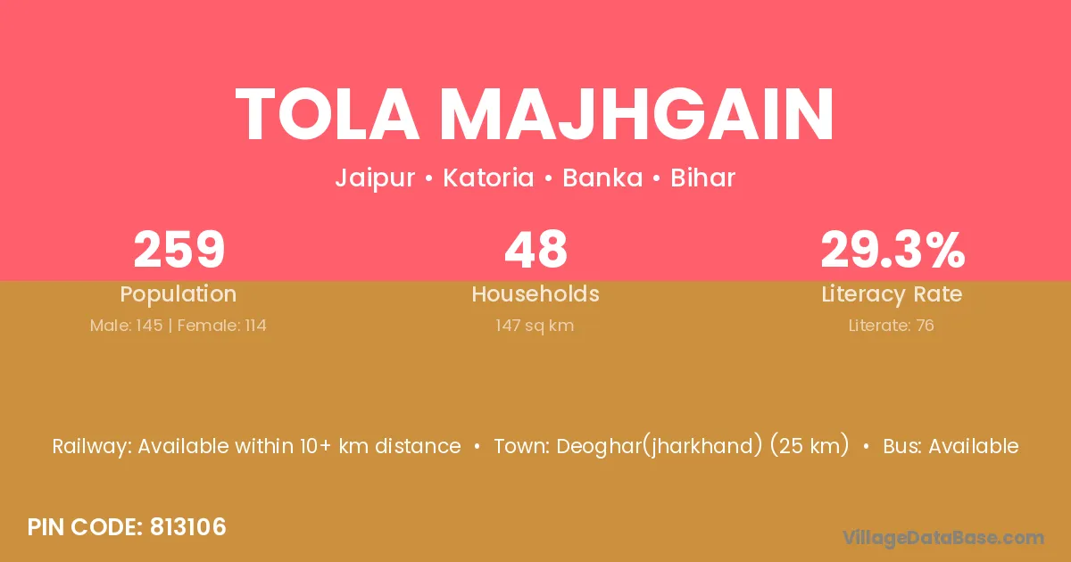 Deoghar(jharkhand) (25 km) is the nearest town to Tola Majhgain village for major economic activities and is located approximately 25 km away.