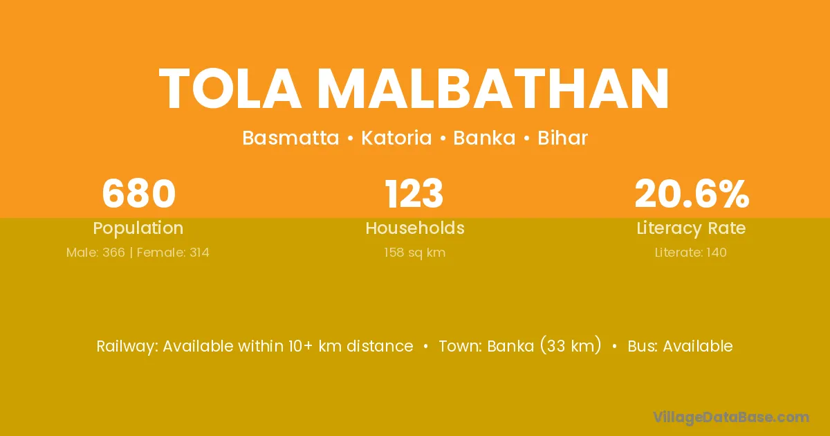 Banka (33 km) is the nearest town to Tola Malbathan village for major economic activities and is located approximately 33 km away.