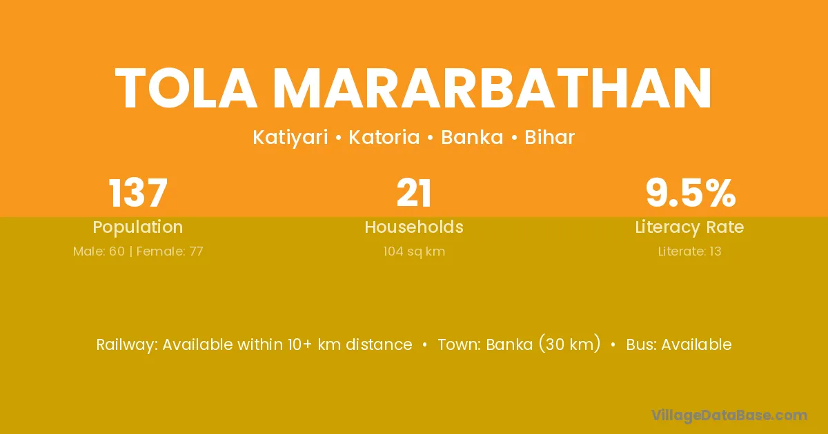 Banka (30 km) is the nearest town to Tola Mararbathan village for major economic activities and is located approximately 30 km away.