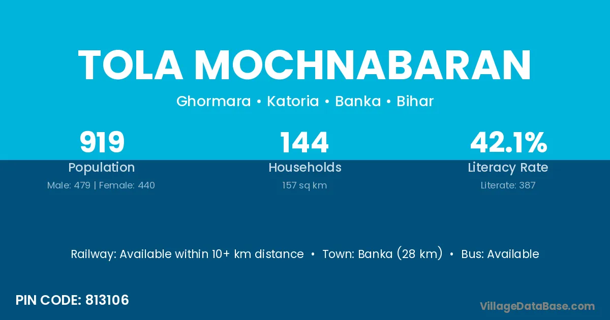 Banka (28 km) is the nearest town to Tola Mochnabaran village for major economic activities and is located approximately 28 km away.