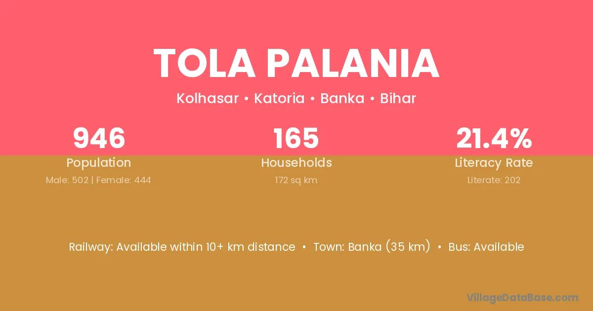 Banka (35 km) is the nearest town to Tola Palania village for major economic activities and is located approximately 35 km away.