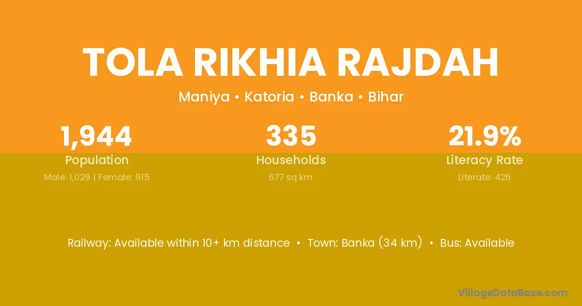 Banka (34 km) is the nearest town to Tola Rikhia Rajdah village for major economic activities and is located approximately 34 km away.