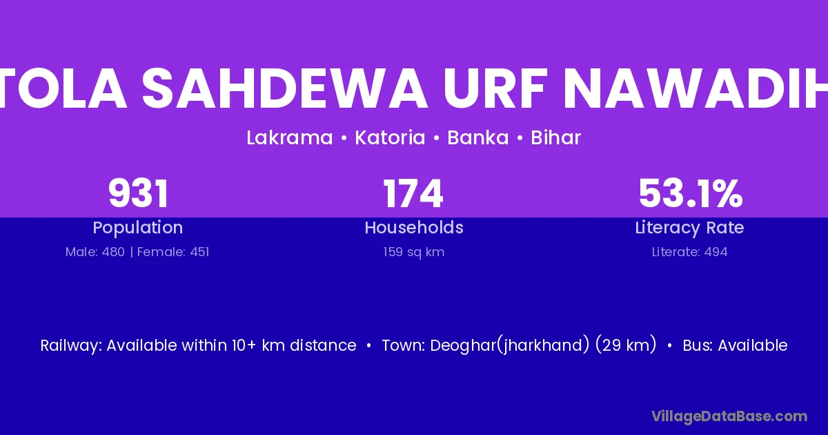 Tola Sahdewa Urf Nawadih village has a total population of 931 people, of which 480 are males and 451 are females.