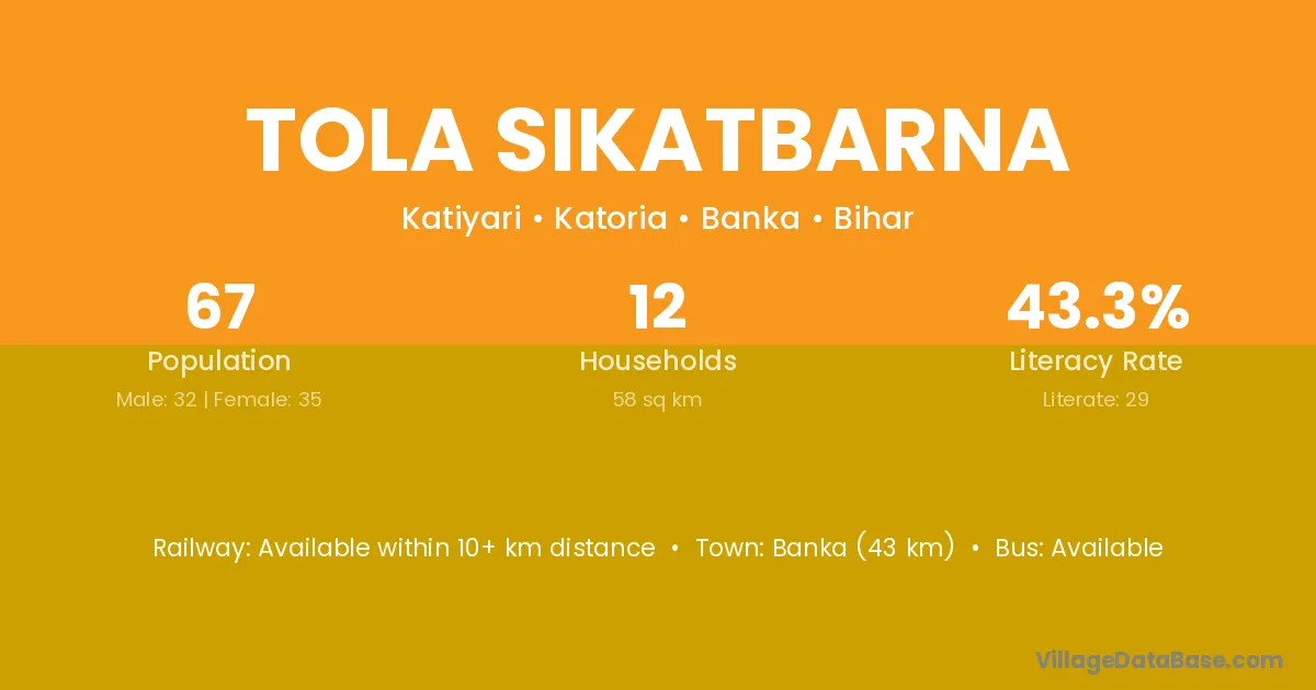 Banka (43 km) is the nearest town to Tola Sikatbarna village for major economic activities and is located approximately 43 km away.