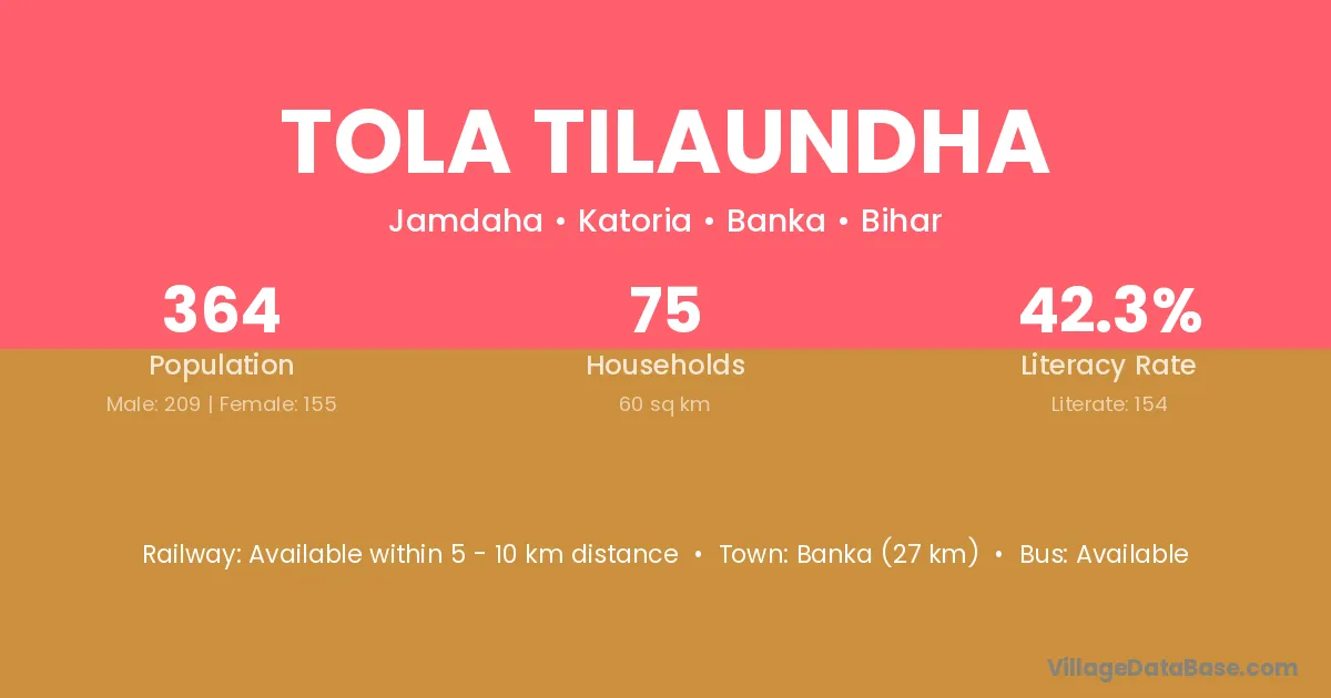 Banka (27 km) is the nearest town to Tola Tilaundha village for major economic activities and is located approximately 27 km away.