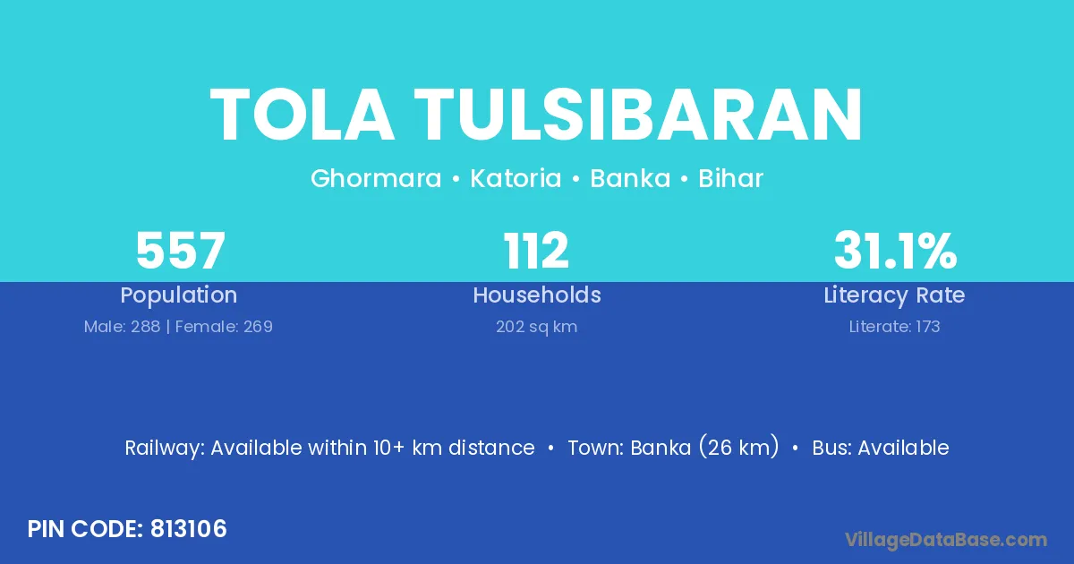 Banka (26 km) is the nearest town to Tola Tulsibaran village for major economic activities and is located approximately 26 km away.