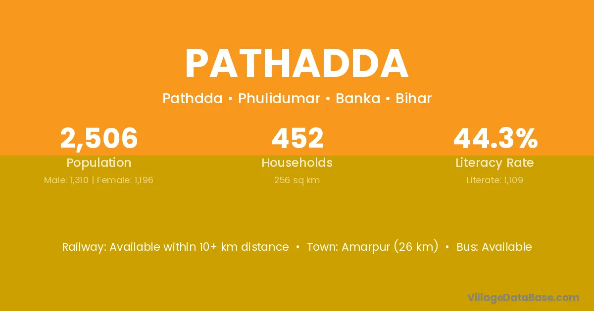 The literacy rate of Pathadda village is 44.25%. Male literacy stands at 55.04% and female literacy at 32.44%.