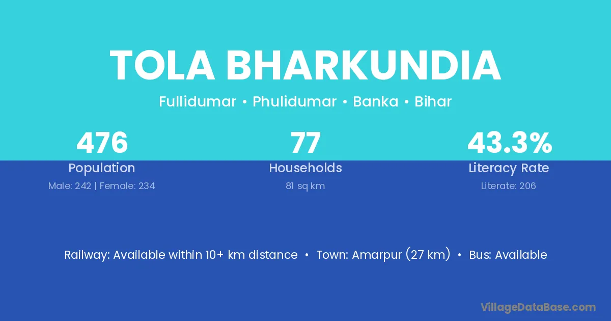 Tola Bharkundia village has a total population of 476 people, of which 242 are males and 234 are females.